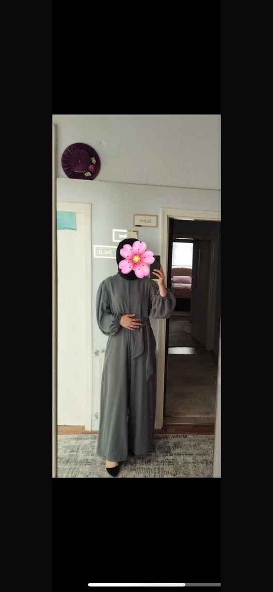 Gri bol paça, kolu lastikli, kendi kumaşından seyyar kemeri mevcuttur. Ben 38 beden giyiyorum ama ürün bol ve biraz daha salaş dursun istediğim için 40-42 beden uyumludur. Şal ve ayakkabı tarzına göre hem özel günlerinizde hem de gündelik olarak tercih edebilirsiniz