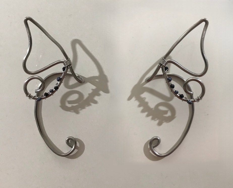 Soyut desenli ve boncuk detaylı gri kulak kıkırdağı. Romantik buluşmalar için avant-garde ve modern tarzda.