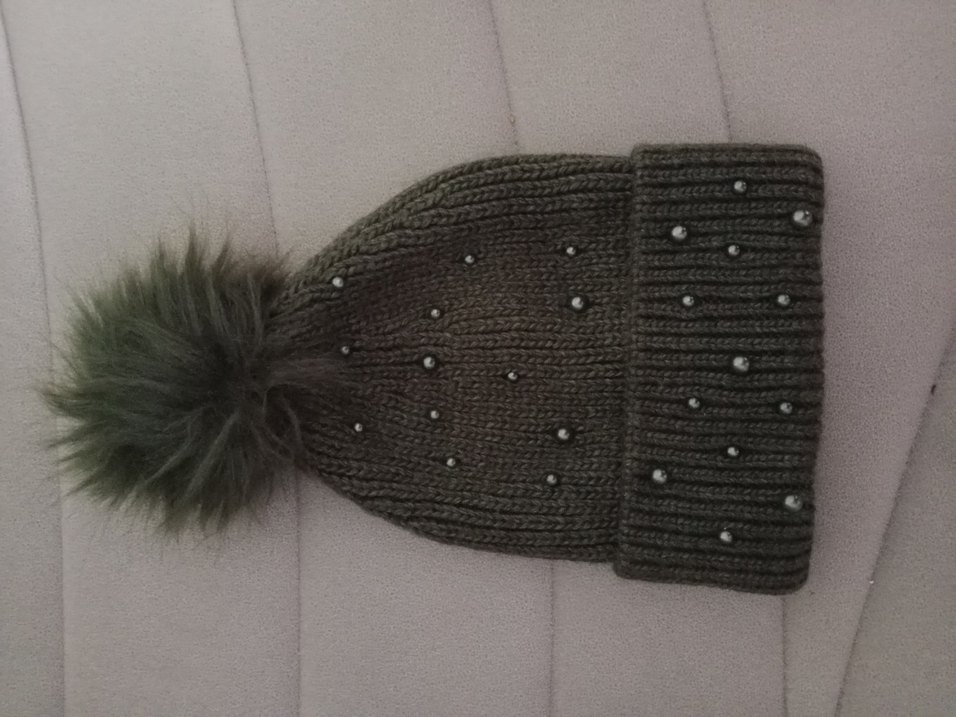 Koyu yeşil renkli kadın örgü bere, inci görünümlü boncuk detayları ve ponpon ile rahat ve sade gotik tarz sunar.