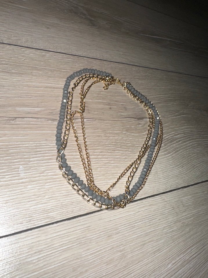 Gri boncuklar ve altın renkli zincir detaylı, kısa uzunlukta, minimalist ve bohem tarzı günlük kullanım için uygun kolye. ✨