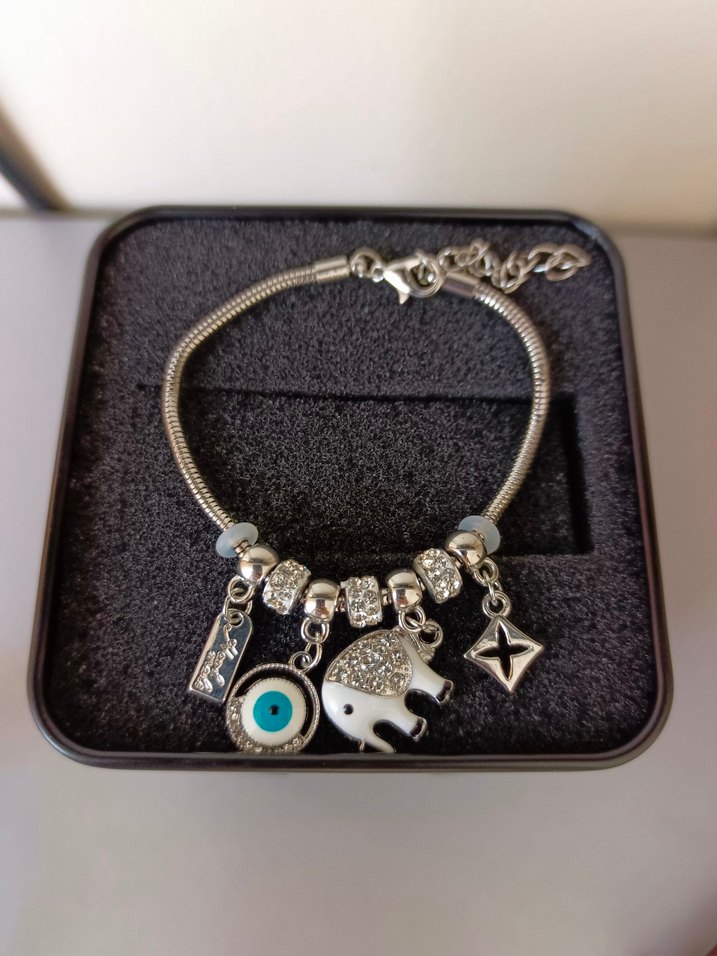 Bohem tarzda gri boncuklu bileklik, fil, nazar boncuğu ve dekoratif figürlerle süslenmiş. Ayarlanabilir tokalı, günlük kullanıma uygun.