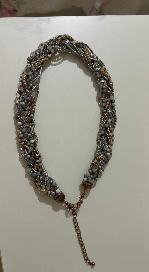 Gri boncuklarla işlenmiş, bohem tarzda kadın kolye, günlük kullanım için uygundur.
