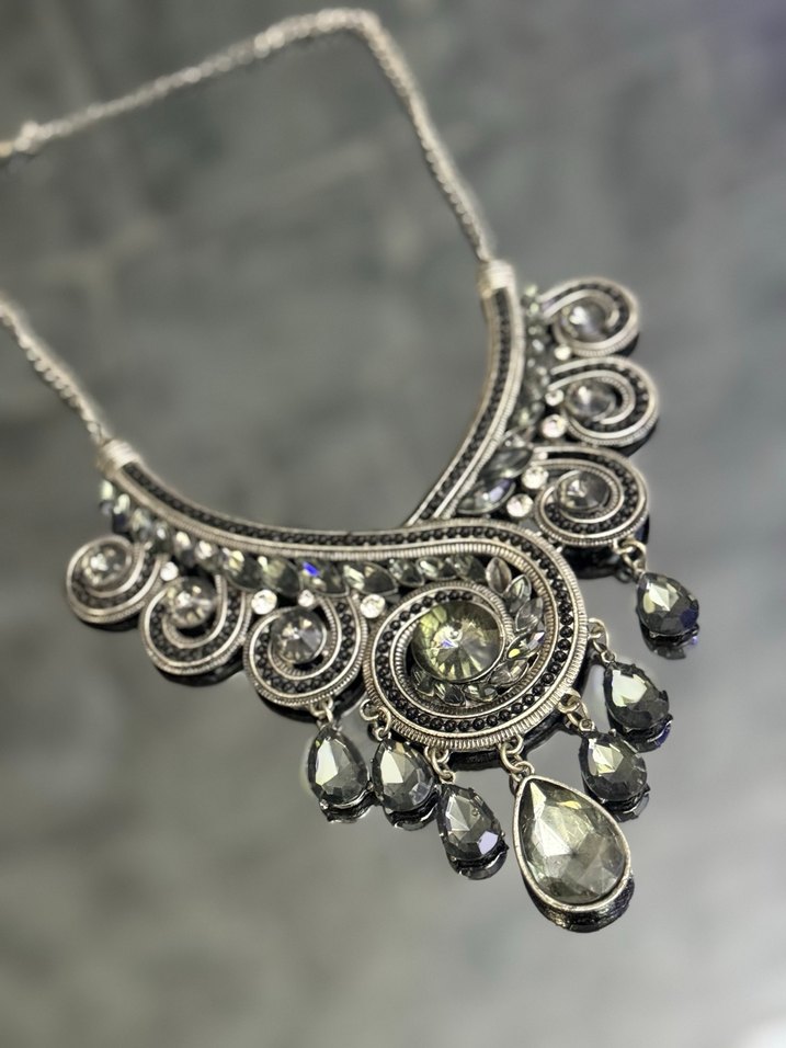 Gri renkte, uzun ve boncuk işlemeli bohem tarzda kadın kolye, düğünler için uygun şık bir tasarım sunar.