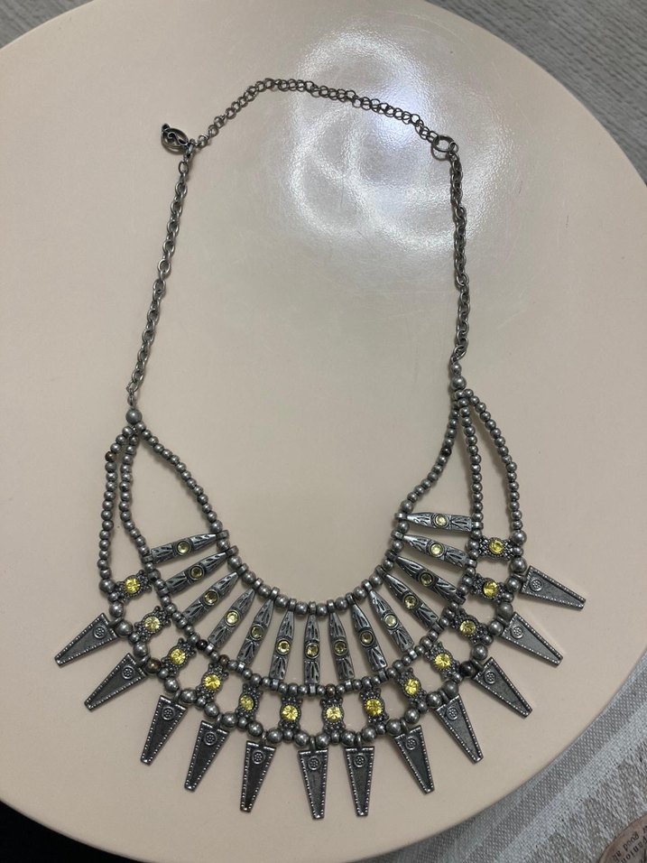 Gri ve altın tonlarında desenli, boncuklu gotik bohem tarzda midi uzunlukta kolye. Günlük kullanıma uygun, retro esintili tasarım.