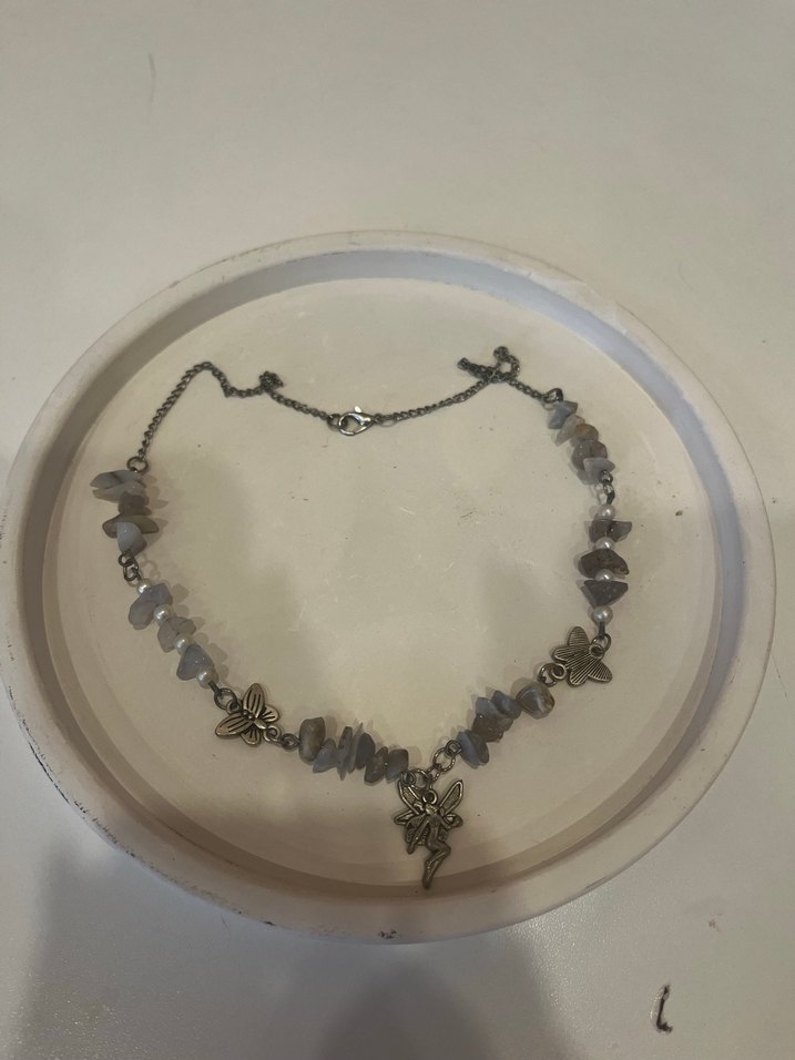 Gri boncuklar ve gotik tarzda figürler içeren midi uzunlukta, günlük kullanıma uygun bohem havasında kolye.