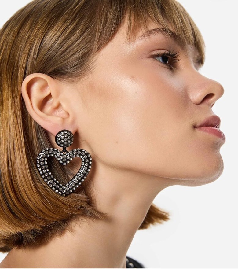 Gri boncuklu, kalp desenli midi uzunlukta, cesur gotik tarzda küpeler. Romantik akşamlar için uygundur.