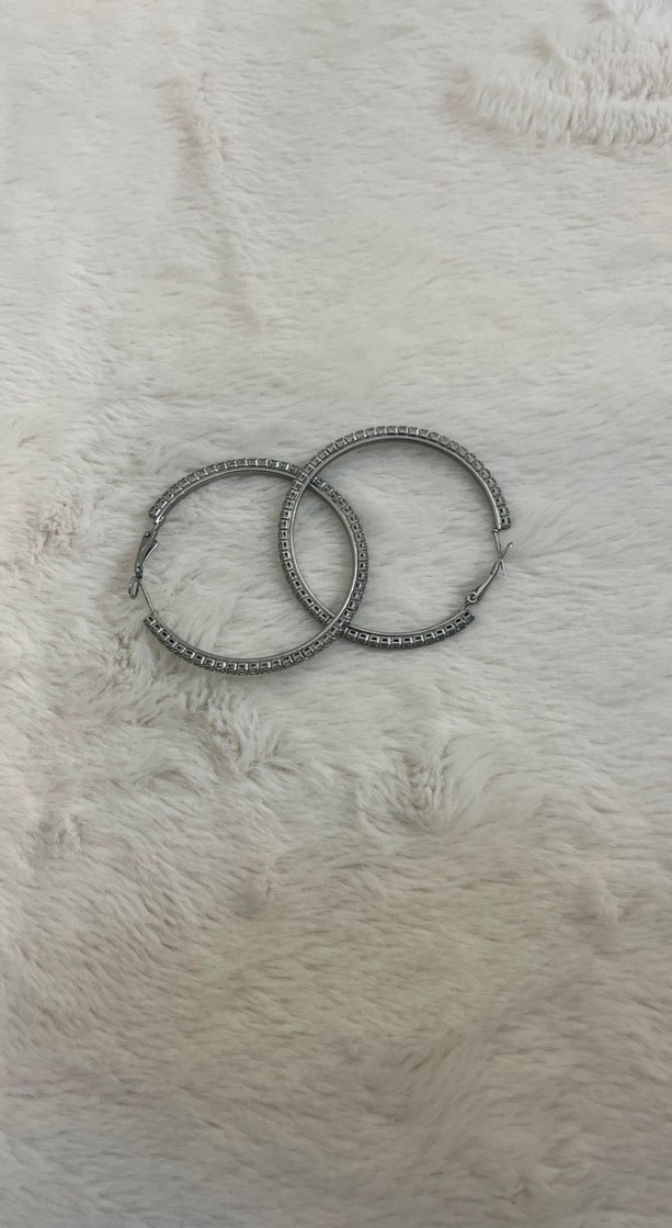 Gri boncuklu, midi uzunlukta halka küpeler. Rahat ve sokak stiliyle günlük kullanıma uygun.