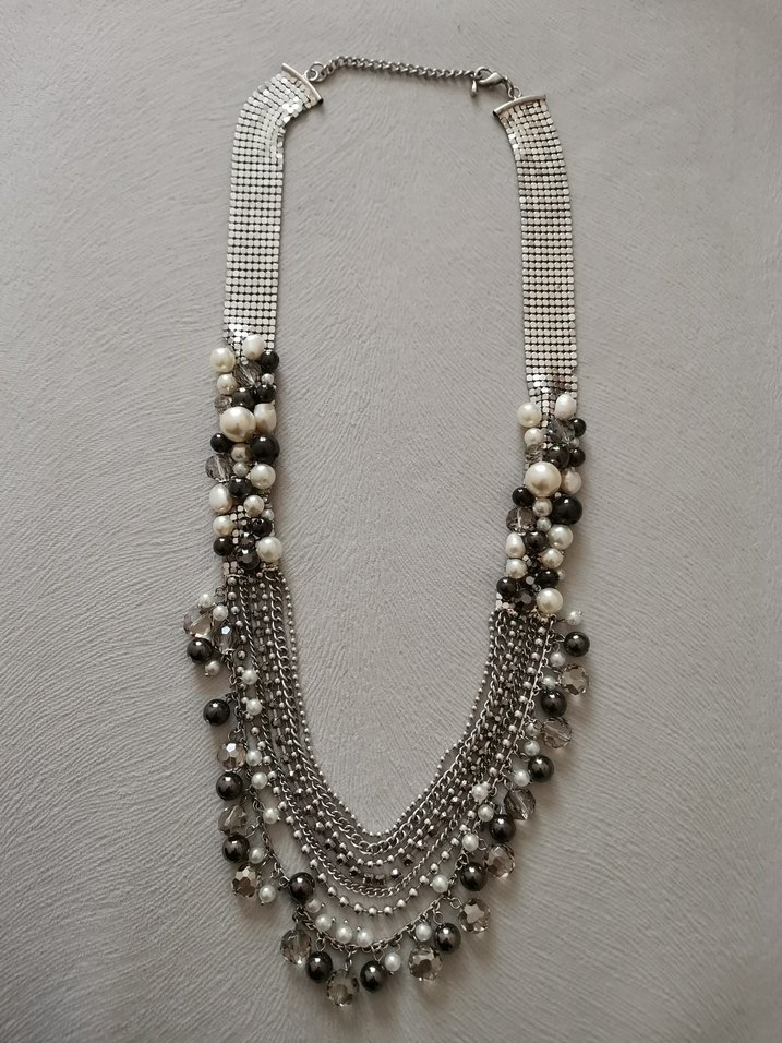 Gri renkte, desenli inci ve boncuk detaylı uzun kadın kolyesi. Çağdaş ve bohem tarzları birleştirir, günlük kullanıma uygundur.