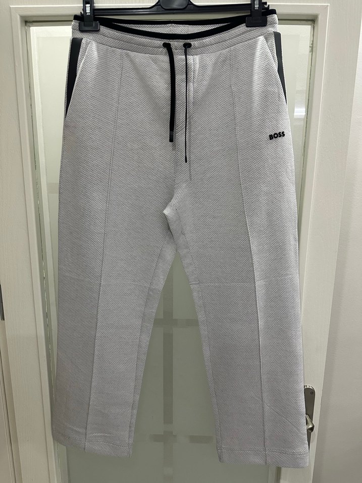 Gri BOSS eşofman altı, kemerli ve rahat kesimlidir. Yumuşak ve sıcak kumaştan, cepli ve desensiz tasarımıyla günlük kullanıma uygundur.