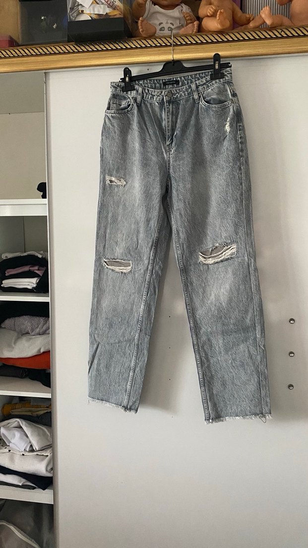 Gri renkli denim kumaştan, yırtık detaylı, salaş kesim kadın kot pantolon. Günlük kullanıma uygun rahat ve şık bir model.