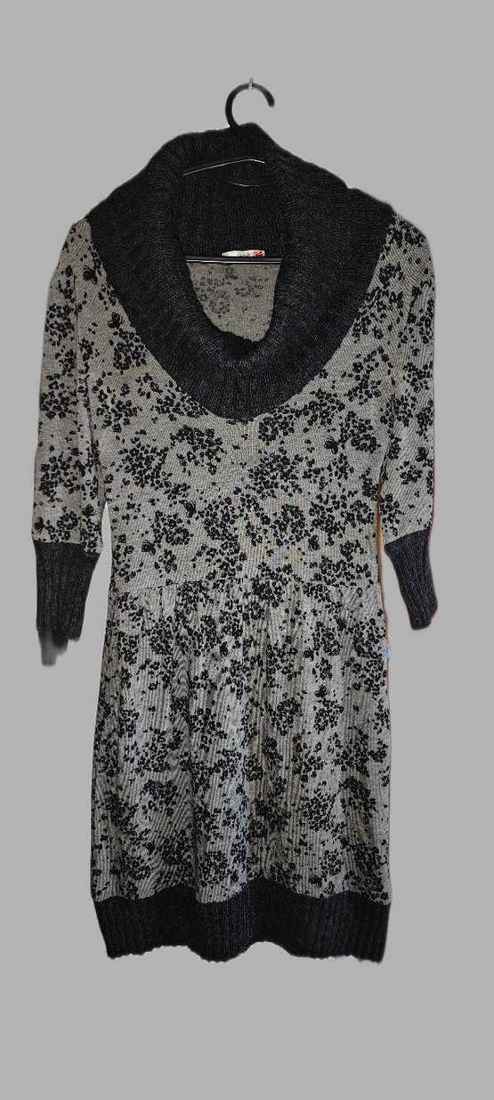 Gri renkli, örgü midi elbise, bol kesim, yakalı ve uzun kolludur. Desenli yapısı ve bohem tarzı ile günlük kullanıma uygundur.