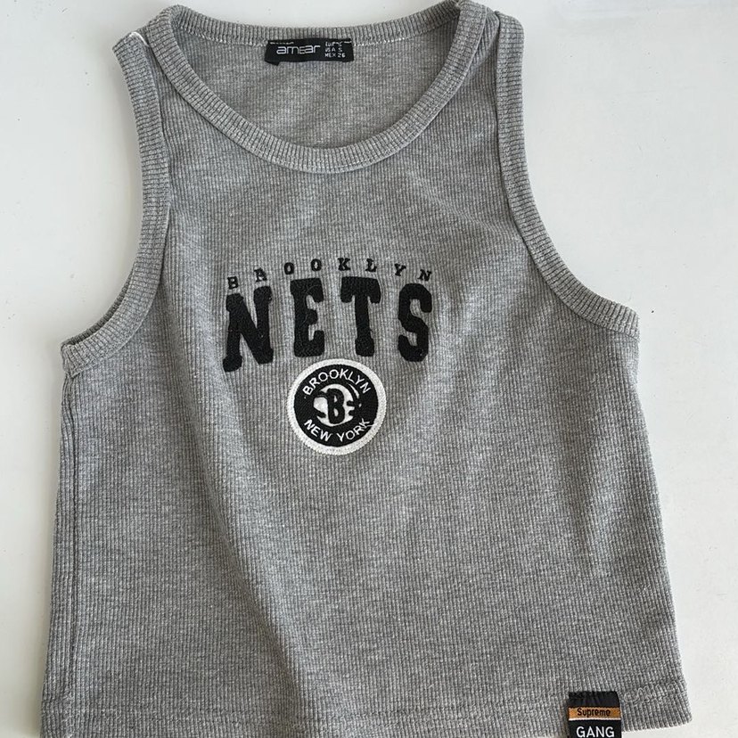 Pamuklu, gri renkli, Brooklyn Nets baskılı, düğmeli, kolsuz, kısa kesim crop top. Spor ve trend günlük tarz için uygun.