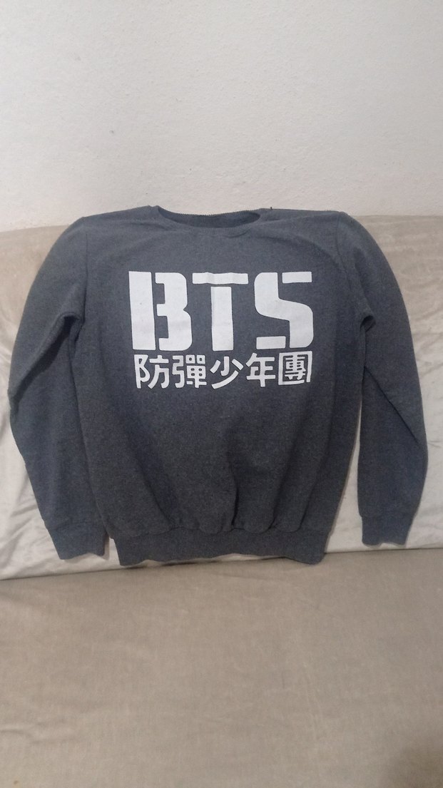 Pamuklu, gri renkli, uzun kollu, yuvarlak yakalı, bol kesim BTS baskılı erkek sweatshirt. Düğme detaylı, rahat sokak stili için uygun.