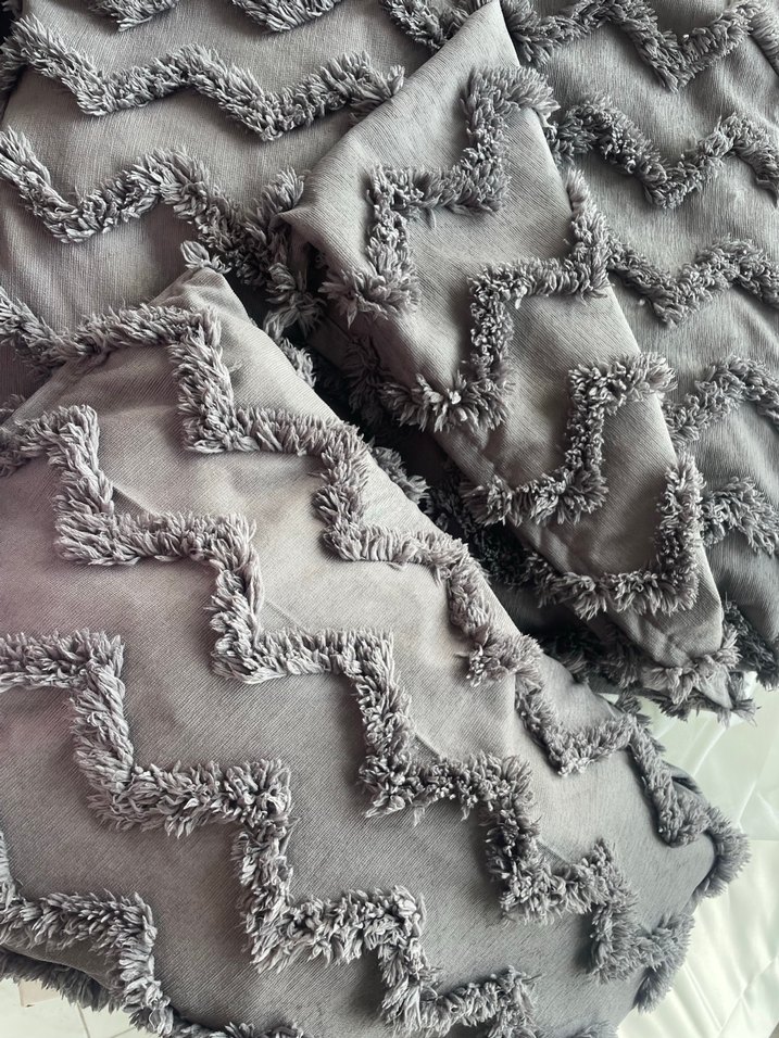 Gri renkte, nakışlı zikzak desenli, yumuşak dokulu bir battaniyedir. Rahat anlar için uygundur. ️