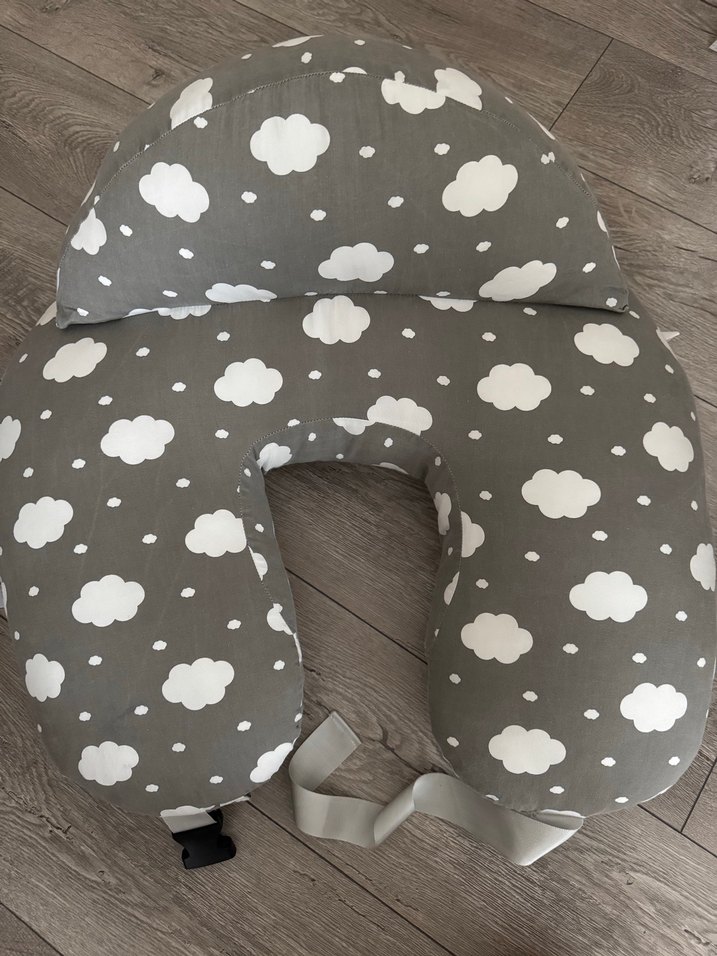 Gri renkte, bulut desenli emzirme ve hamile yastığıdır. Ayarlanabilir kayış ile destek sağlar. ☁️