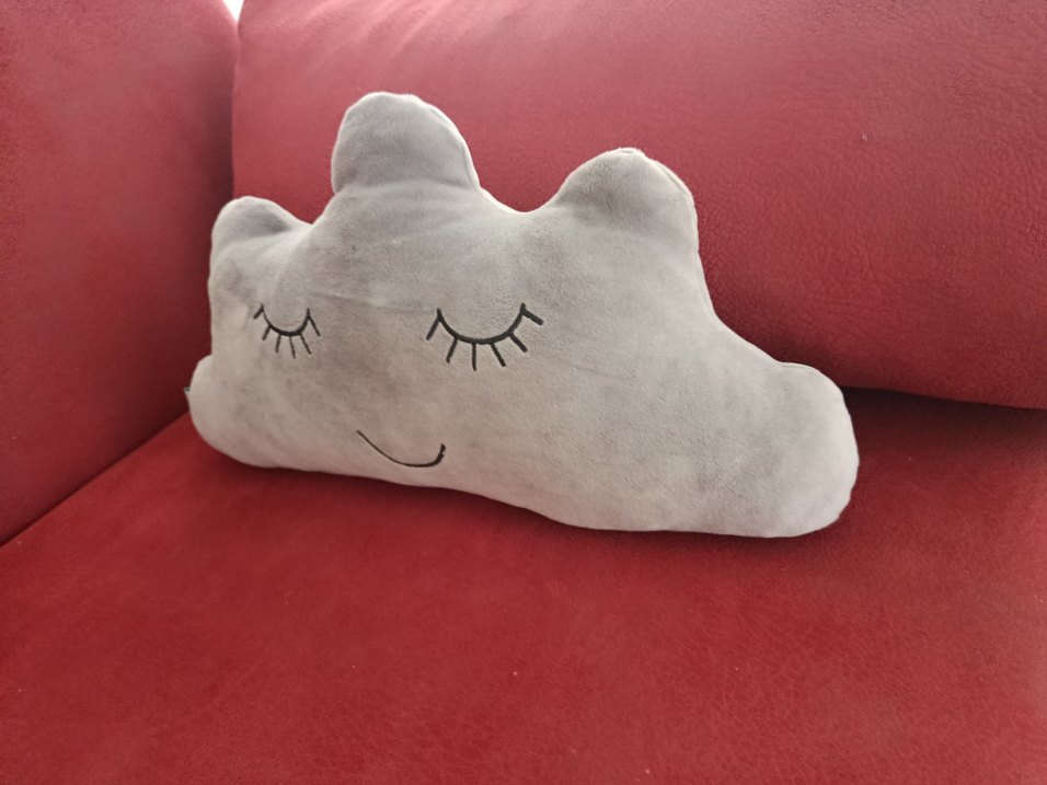 Gri renkte, bulut şeklinde, kapalı göz ve gülümseme işlemeli yumuşak peluş oyuncak