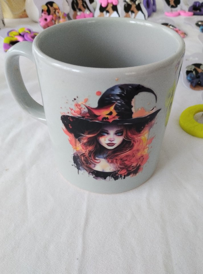 Gri seramik kupa üzerinde alev saçlı ve sivri şapkalı cadı tasviri bulunur. Tutma sapı sağlam ve yüzeyi pürüzsüzdür. ♀️