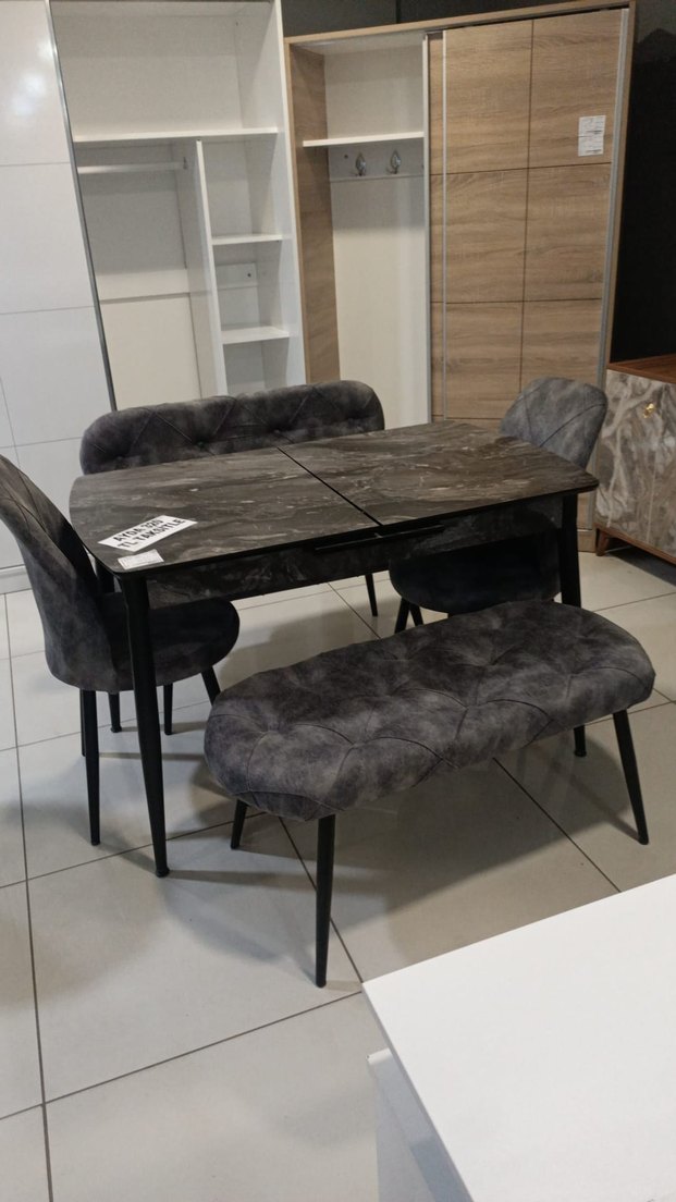 Gri çağdaş yemek masası, siyah ayaklı, düz yüzeyli masa, iki yastıklı sandalye ve yastıklı bir bench içerir. Desensiz tasarımı modern bir görünüm sunar. ️