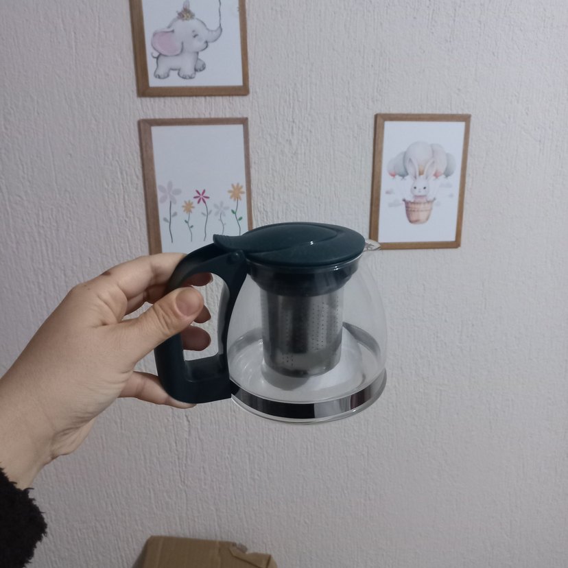 Gri renkte camdan yapılmış, metal süzgeçli ve kolay tutulan saplı demlik. Demleme için uygundur.