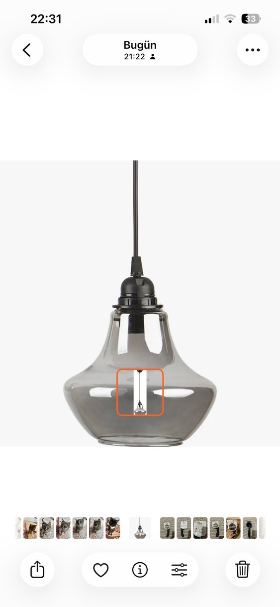 Gri cam gövdesi ve bej kablosu ile modern ve şık bir sarkıt lamba. Şeffaf cam yumuşak ve ortam aydınlatması sağlar.