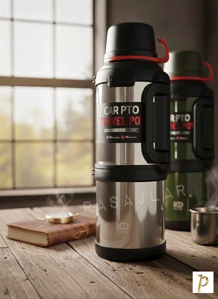 Gri ve camel renklerde, sağlam saplı ve güvenli kapaklı çocuk termos şişesi. 'CARPTO TRAVEL PO' yazısı bulunur. ☕