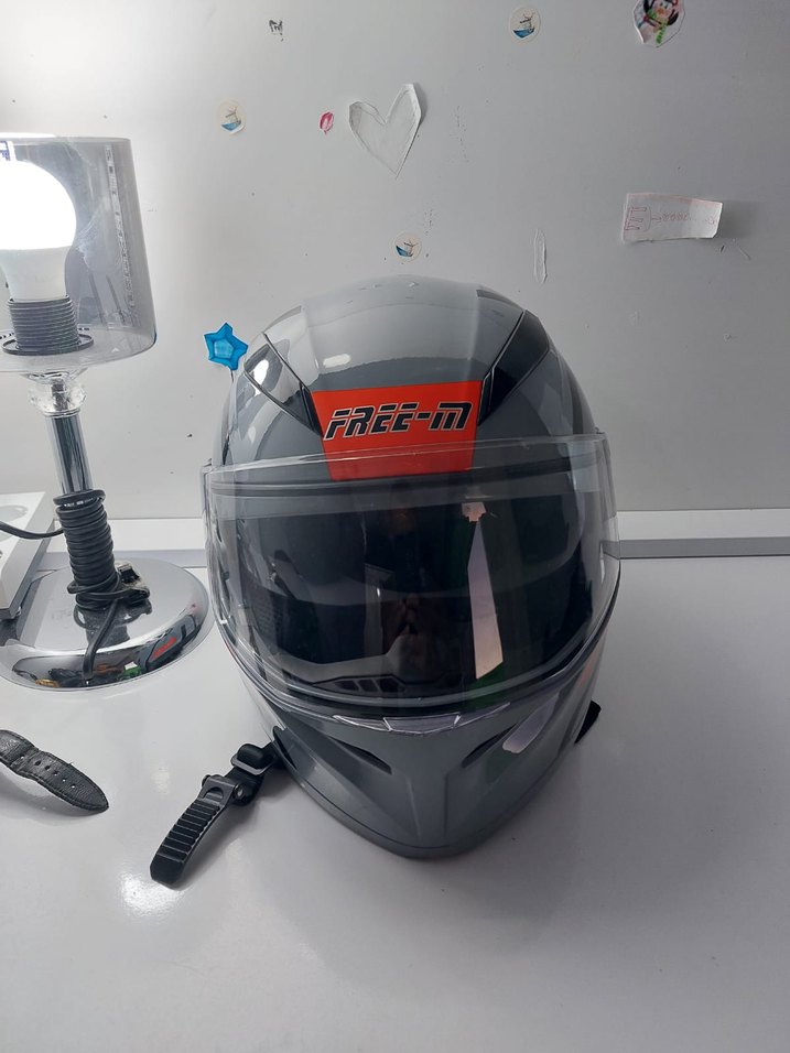 Gri renkte, cam vizörlü ve tokalı kayışlı biker motosiklet kaskı. Üzerinde 'FREE-m' yazısı ve baskılı desen bulunur. Sokak stili ve rock punk havası sağlar. ️