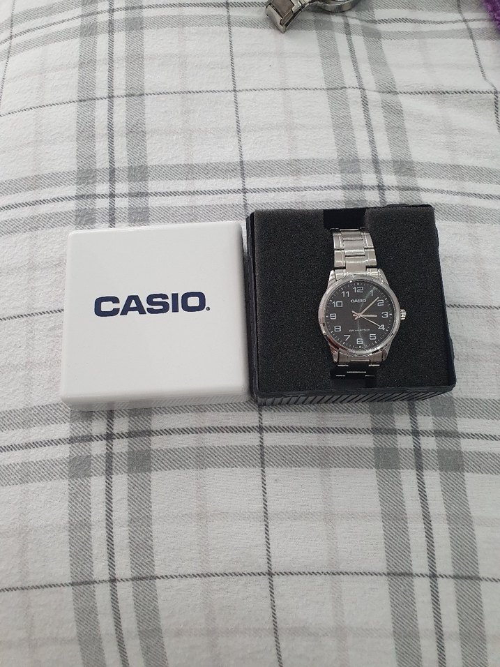 Casio marka, gri metal kayışlı erkek kol saati. Siyah kadran ve beyaz rakamlarla iş ve sokak stilini birleştirir. ⌚