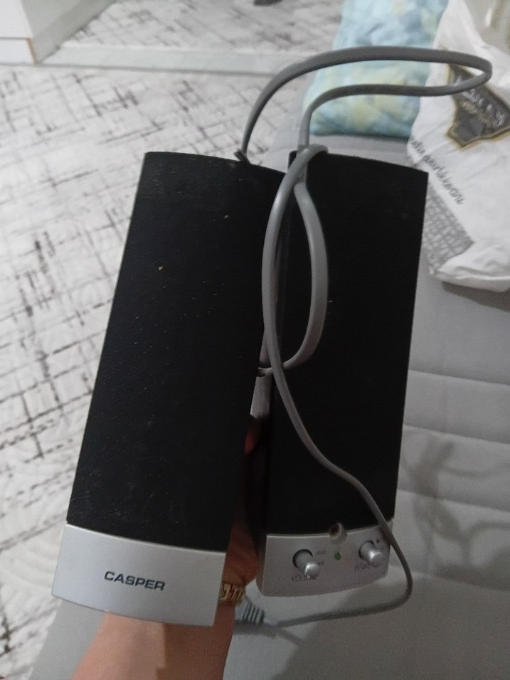 Gri Casper marka müzik sistemi hoparlörleri, kablolu bağlantıya sahip. Ses ve ton ayar düğmeleri bulunur.