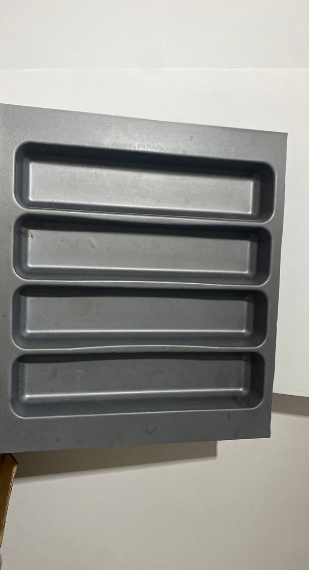 Dört bölmeli gri çatal kaşık düzenleyici, mutfak eşyalarını düzenlemek için kullanılır. Sadece kenarları kesildi çekmeceye olmadı diye su lekeleri var yıkanınca gider