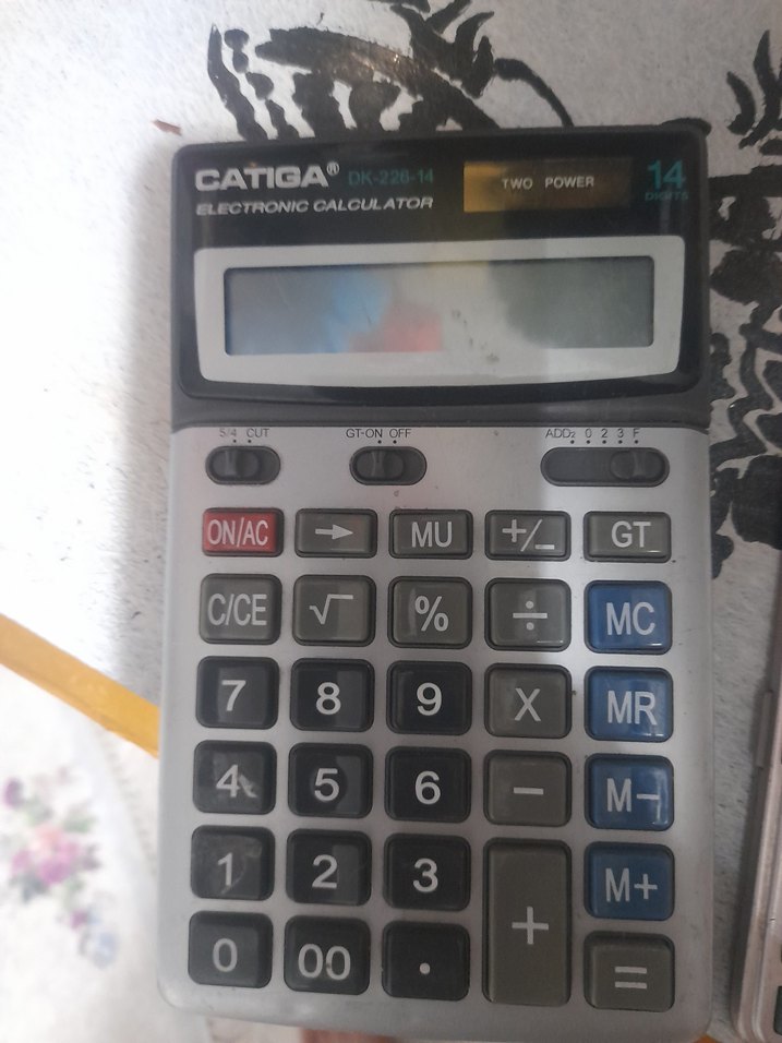 Gri CATIGA hesap makinesi, iki güç kaynağı ve yüzde, hafıza, temel aritmetik işlemler gibi fonksiyon tuşlarına sahiptir. 14 haneli ekranlıdır. biri çalışır durumda öbürü bilmiyorum pilmi gerekli ikiside satılık