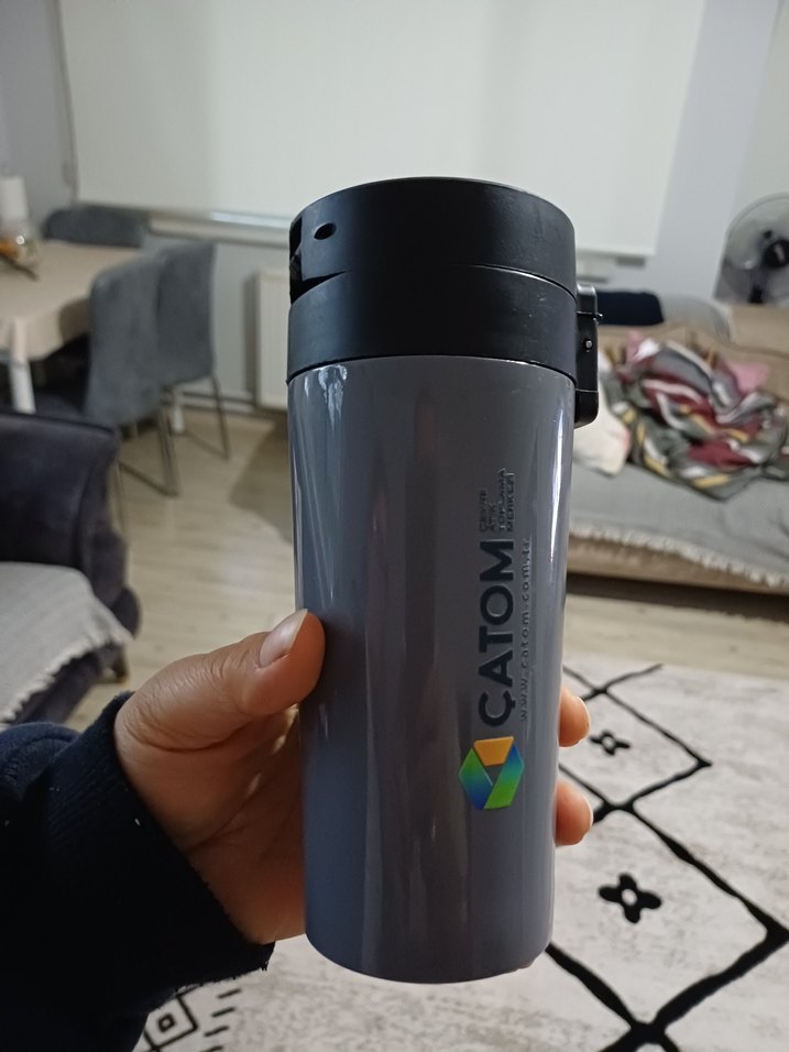 Gri Catom çocuk termosu, içecekleri sıcak veya soğuk tutar. Güvenli kapağı ve taşınabilir kompakt tasarımı vardır.