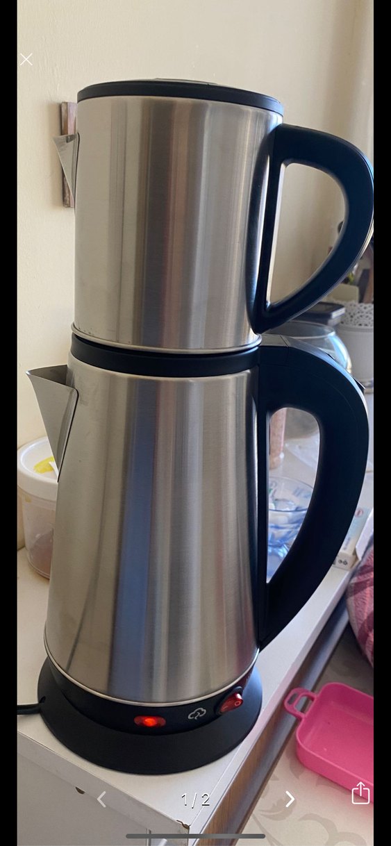 Gri renkli çay makinesi, paslanmaz çelik gövde ve siyah saplara sahiptir. Kolay dökme için musluk ve demleme bölümü bulunur. Ürün ithaldir