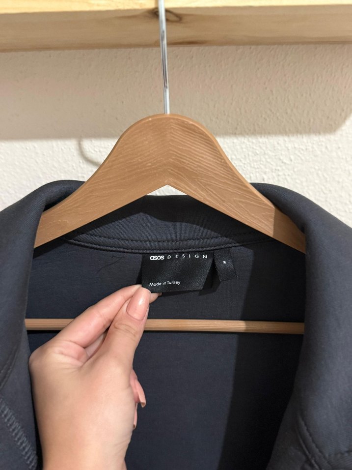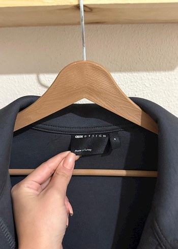 Gri ceket,bisiklet yakası ve uzun kollu, oversize dikkat çeker. Midi boy, baskılı deseniyle günlük rahat stil için uygundur.