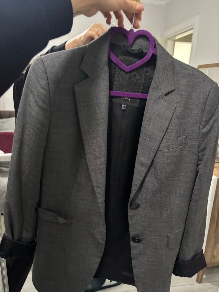 Gri takım elbise ceketi, kesik yaka ve düğmeli ön kısmıyla. Uzun kollu, normal kesim, ofis veya sokak stiline uygun. Beden uymadığı için satıyorum