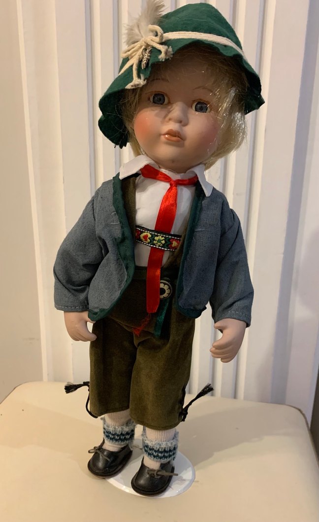Bu oyuncak bebek gri ceket, beyaz gömlek ve kırmızı kravat, kahverengi pantolon ve örme çoraplara sahiptir. Sarı saçlı ve mavi gözlüdür. Temiz bir üründür.Çocuğunuzu sevindirmek isterseniz güzel bir hediye olur.