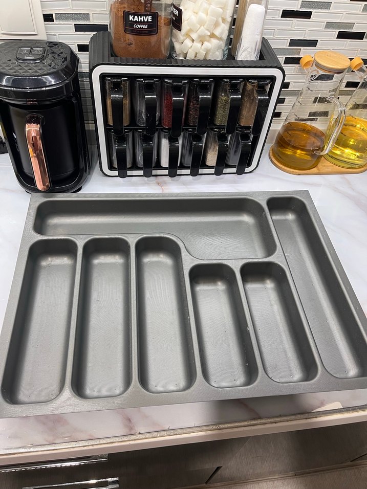 Gri renkte, çekmece için tasarlanmış kaşıklık düzenleyici, birden fazla bölmesiyle mutfak gereçlerini kolayca ayırır.