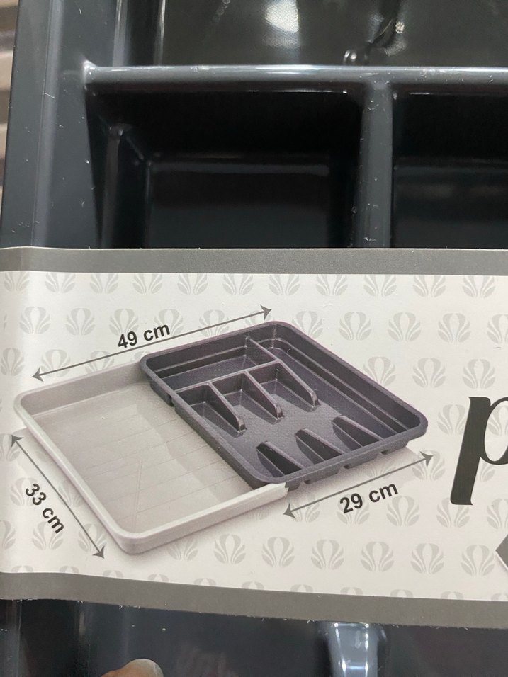 49x33 cm ölçülerinde, çok bölmeli gri çekmece kaşıklık organizeri, mutfak eşyalarını düzenlemek için tasarlanmıştır.