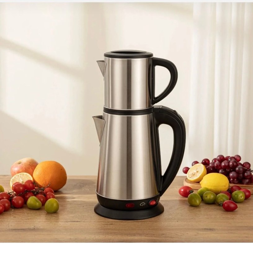 Gri çelik çay makinesi, ayrı su ısıtma ve demlik bölümleriyle tasarlanmıştır. Siyah ergonomik saplara ve gösterge ışıklarına sahiptir otomatik modu mevcuttur