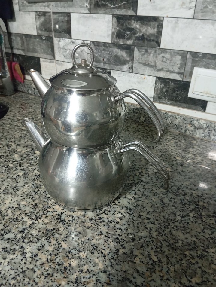 Gri renkte, paslanmaz çelikten yapılmış, üst üste duran ve kavisli saplı çaydanlık seti. ☕