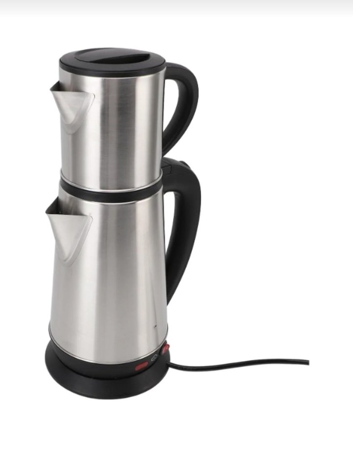 Gri çelikten yapılmış, üst üste yerleştirilmiş iki su ısıtıcısı ve siyah saplı elektrikli çay makinesi. Gösterge ışıklı taban içerir. ☕