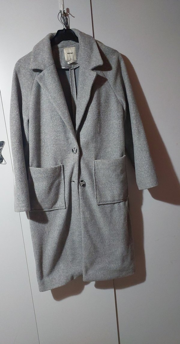 Uzun gri kaban, büyük ön cepler ve düğme kapamalı, sade ve kullanışlı tasarıma sahiptir.