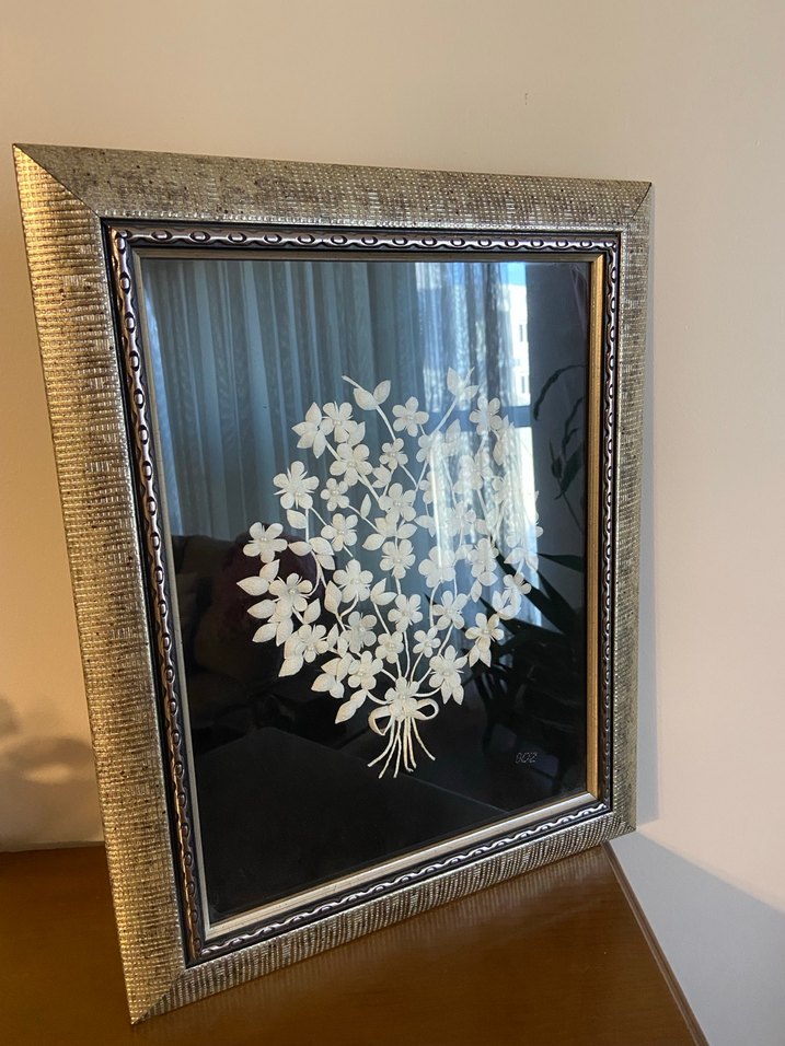 Beyaz çiçek desenli siyah zemin üzerinde, dokulu gri çerçeveli tablo. Her ortama ince bir şıklık katıyor. İpek Koza’sı kullanılıyor
