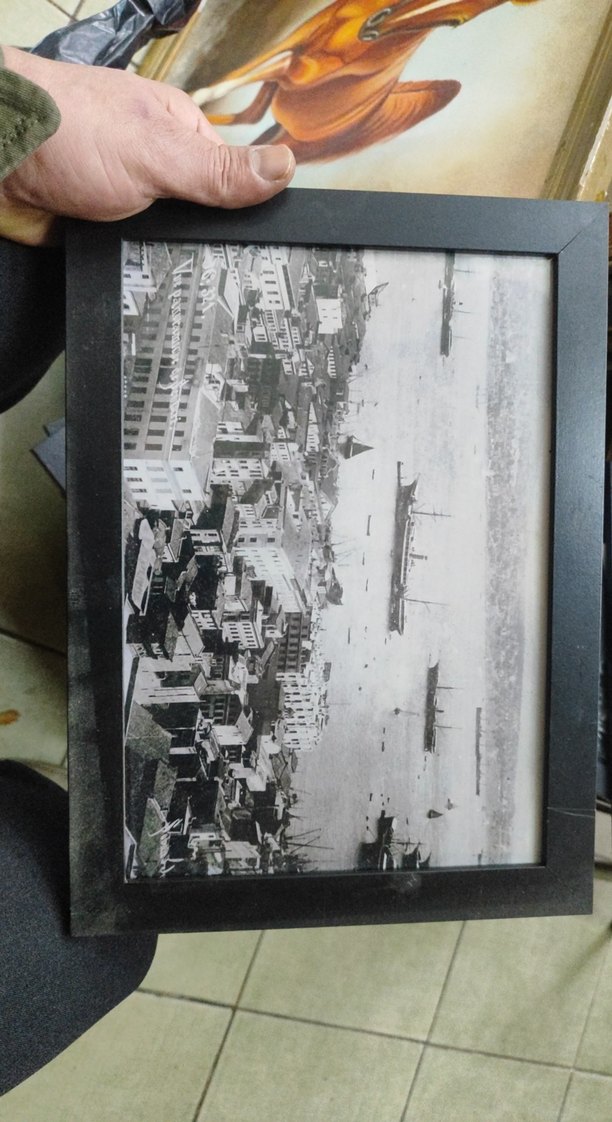 Siyah beyaz deniz manzaralı tablo, gri çerçevede. Liman ve çevresindeki binaların detaylı görüntüsü yer alıyor. ️
