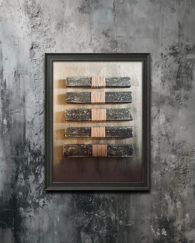 Gri çerçeve içinde, açık bantlarla bağlanmış dokulu yatay soyut elemanlar bulunan modern duvar dekoru. ️