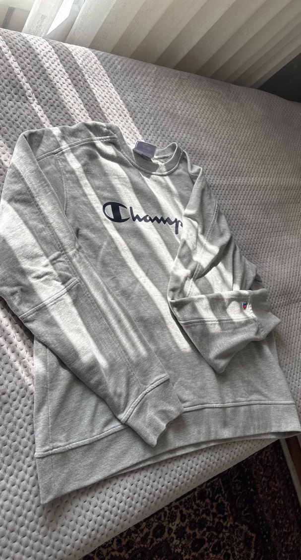 Gri renkli Champion sweatshirt, uzun kollu, yuvarlak yaka ve bol kesimdir. Yumuşak keten kumaştan üretilmiş, sade ve şık bir görünüme sahiptir. Rahat günlük kullanım için uygundur.