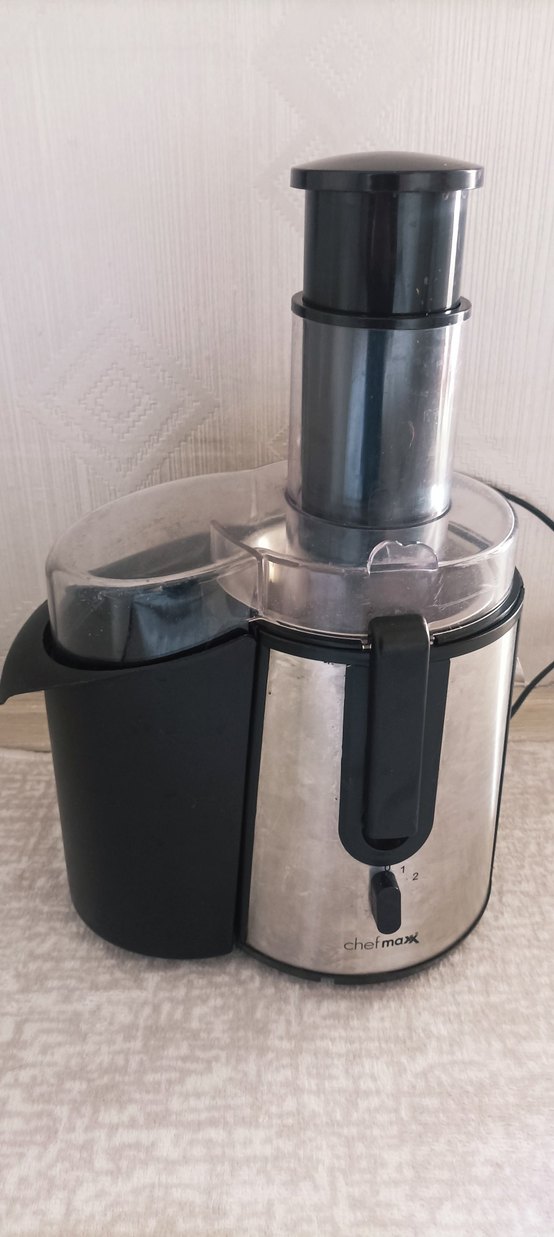 Gri Chefmax katı meyve sıkacağı, şeffaf besleme haznesi ve paslanmaz çelik gövdeye sahiptir. Güvenli kilit kolu ve kontrol düğmesi bulunur.