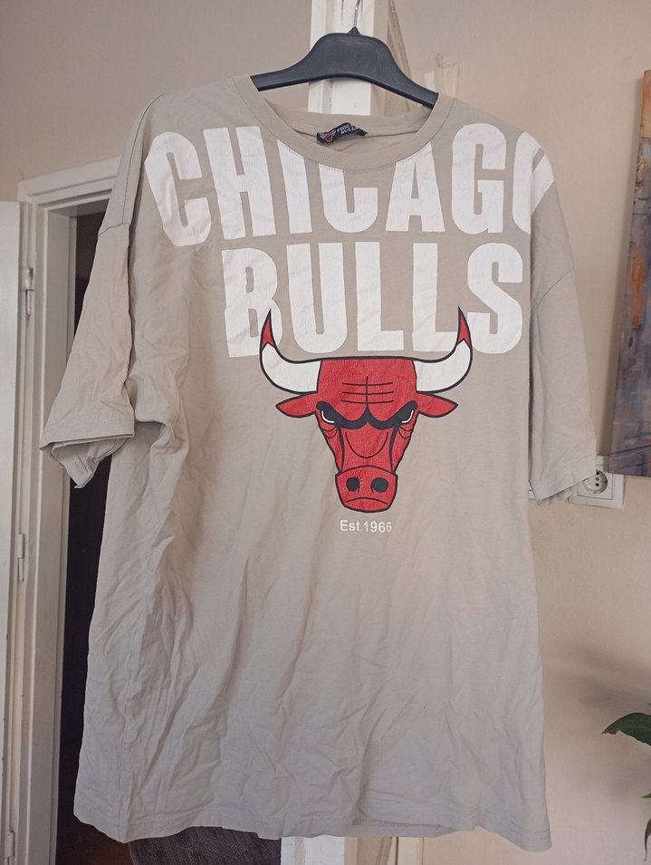 Pamuklu, gri renkli, bol kesim, kısa kollu, bisiklet yaka, önü Chicago Bulls baskılı erkek tişörtü.