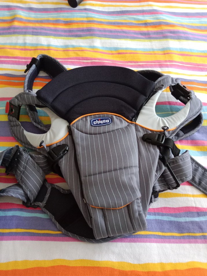 Gri renkli Chicco bebek taşıyıcı, konfor için dolgulu askılar ve ayarlanabilir tokalar içerir. Çizgili deseni ve destekleyici yapısı vardır.