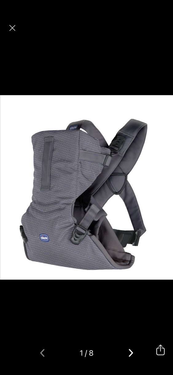 Gri Chicco bebek taşıyıcı, rahat taşıma için dolgulu askılar ve ayarlanabilir tokalar içerir. Güvenli ve ergonomik bebek desteği sağlar.