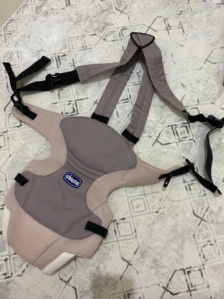 Ayarlanabilir kayışlı gri Chicco bebek taşıyıcı. Yumuşak kumaşıyla rahat kullanım sağlar. Hiçbir sorunu yok